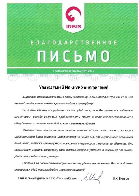 ООО "ТК "ТранзитСити" выражает благодарность за взаимное сотрудничество и предоставленное светотехническое оборудование для подсвечивания стеллажей с товаром на АЗС IRBIS в н. п. Сокуры.