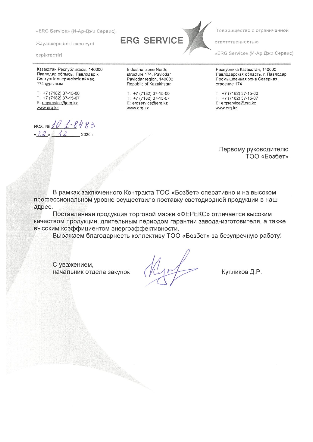 Руководство ТОО «ERG Service» выражает благодарность за высокое качество продукции ТД «ФЕРЕКС».