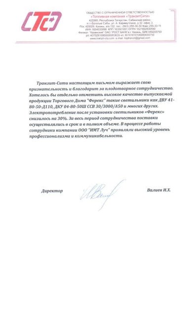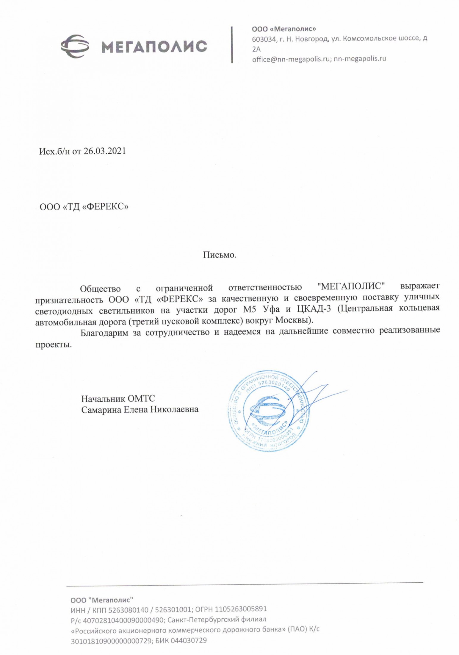 "Выражаем признательность ООО "ТД "ФЕРЕКС" за качественную и своевременную поставку уличных светильников"