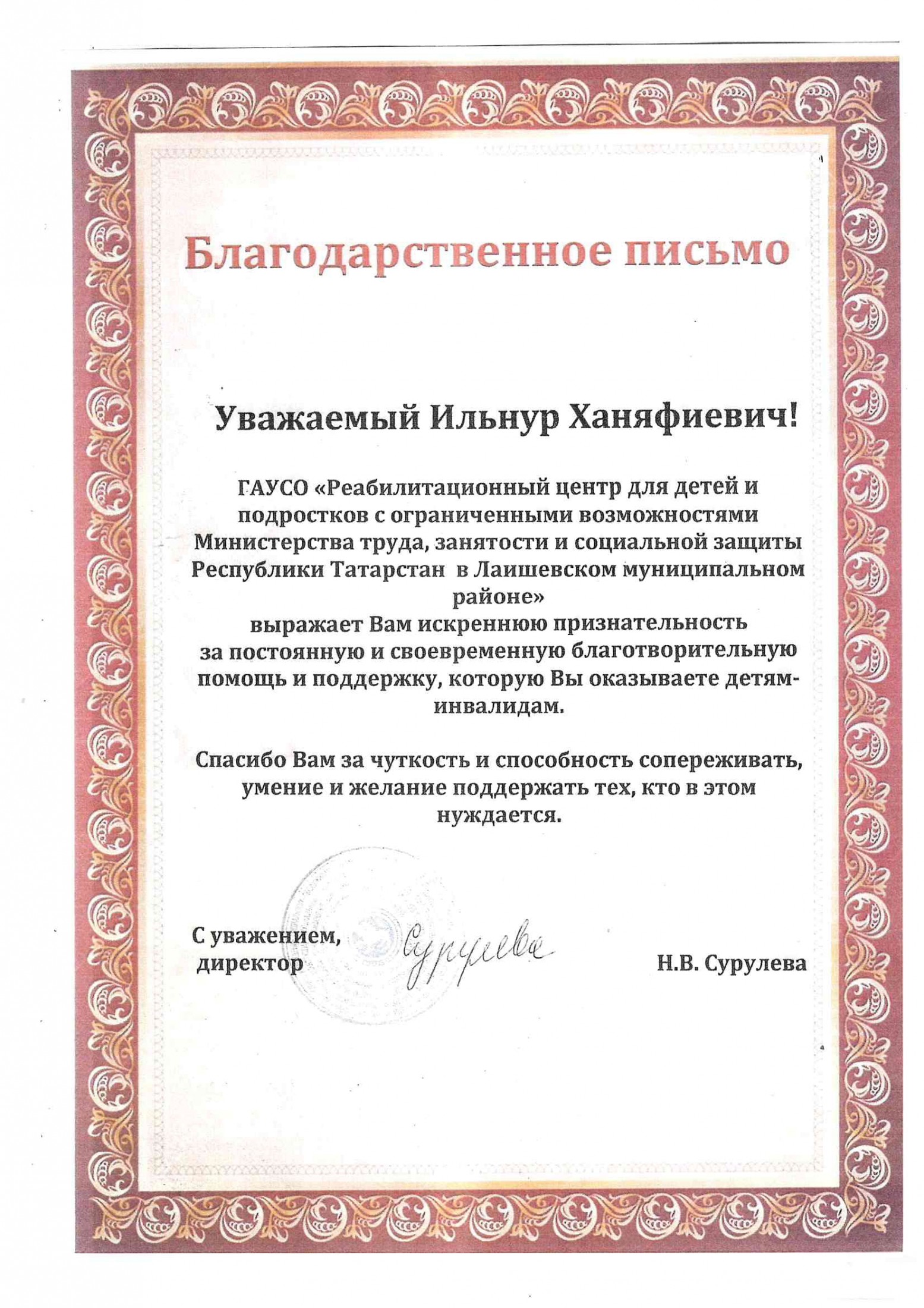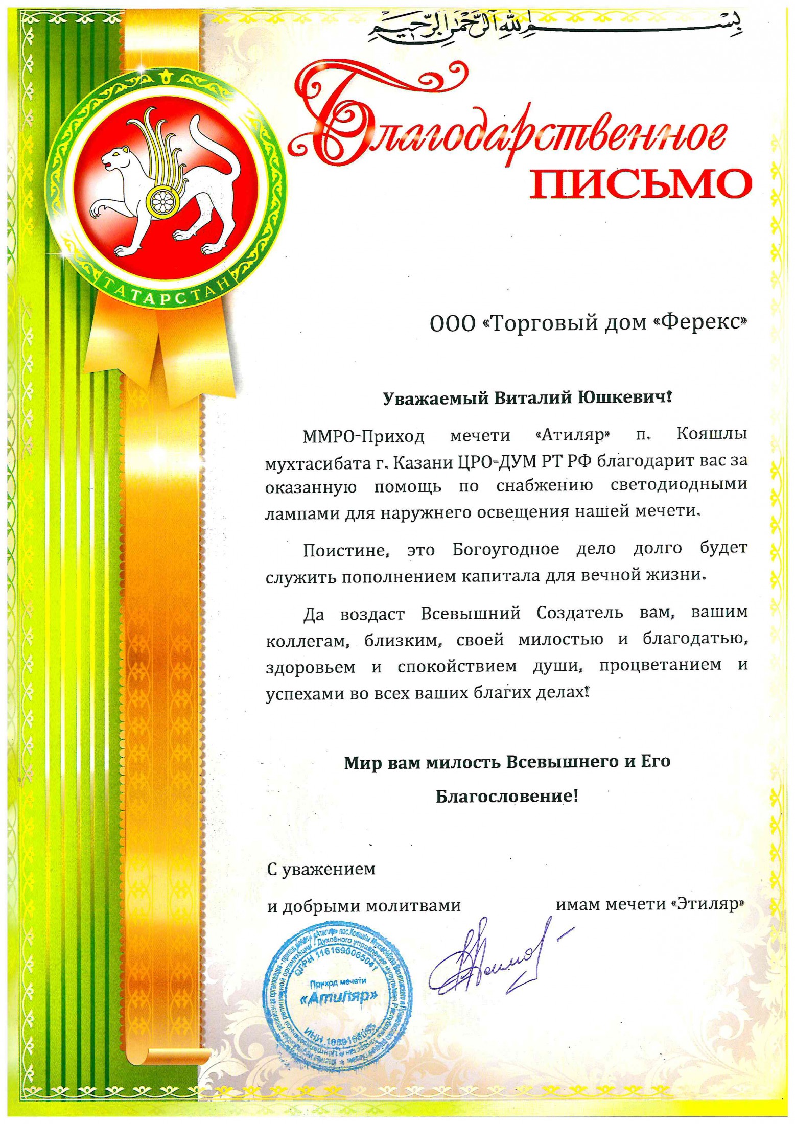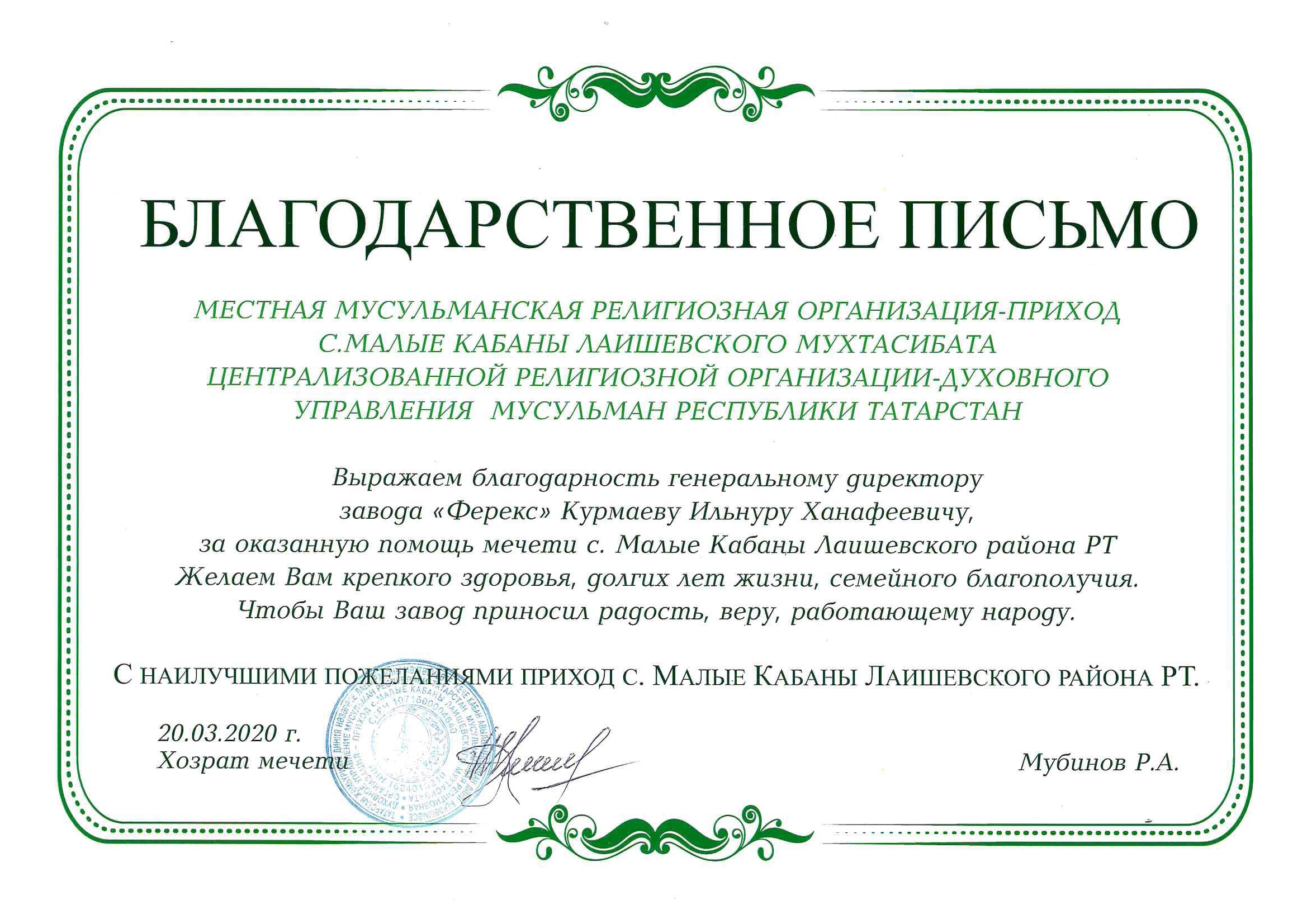 "Выражаем благодарность за оказанную помощь в освещении мечети с. Малые Кабаны Лаишевского района РТ."