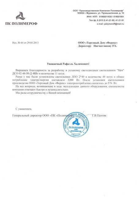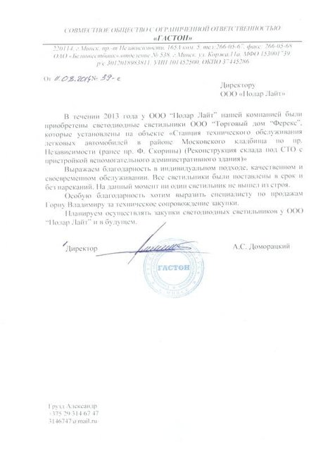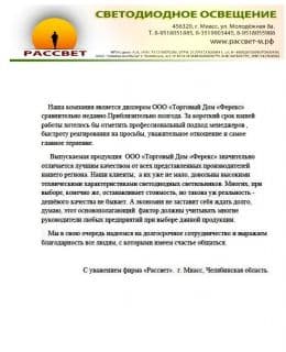 Производственное унитарное предприятие "Пинскдрев-Плайвуд" выражает благодарность за поставку и помощь при подборе качественного осветительного оборудования - светодиодных светильников российского производства ООО "Торговый дом "ФЕРЕКС".