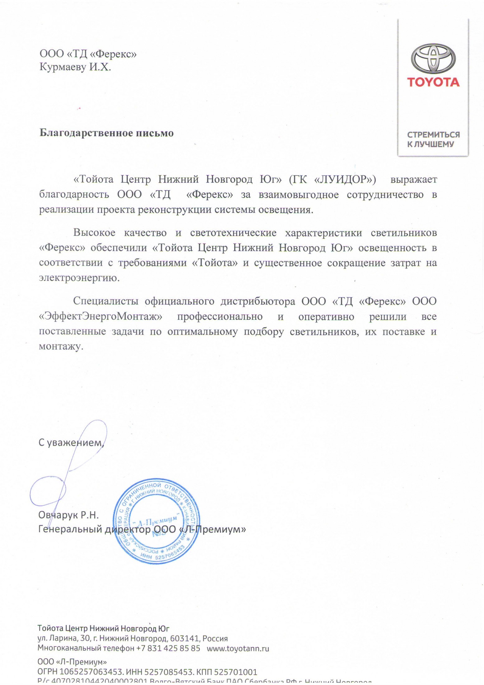 "Тойота Центр Нижний Новгород Юг" (ГК "ЛУИДОР") выражает благодарность ООО "ТД "Ферекс" за взаимовыгодное сотрудничество в реализации проекта реконструкции системы освещения.
