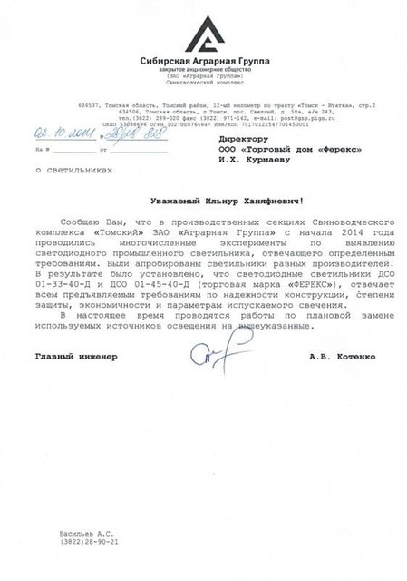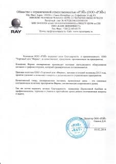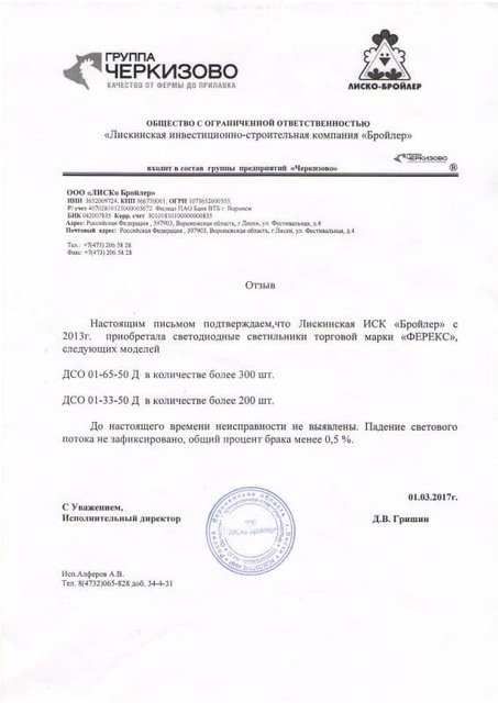 Настоящим письмом подтверждаем, что Лискинская ИСК «Бройлер» с 2013г. приобретала светодиодные светильники торговой марки "ФЕРЕКС"