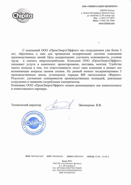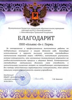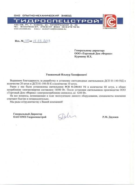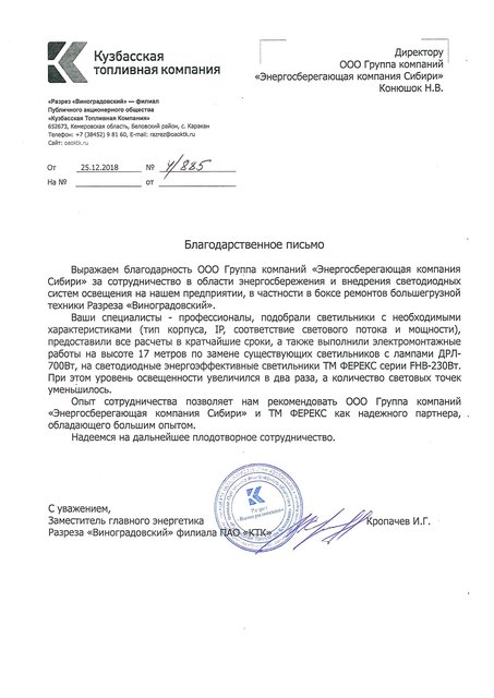 Выражаем благодарность в индивидуальном подходе, качественном и своевременном обслуживании. Все светильники были поставлены в срок и без нареканий. На данный момент ни один светильник не вышел из строя.
