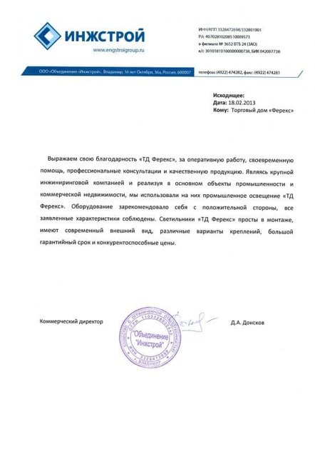 ООО «Торговый Дом «Ферекс», являясь поставщиком светодиодных светильников собственной разработки, зарекомендовало себя надежным поставщиком, выполняющим свои договорные обязательства в установленные сроки с высочайшим качеством.