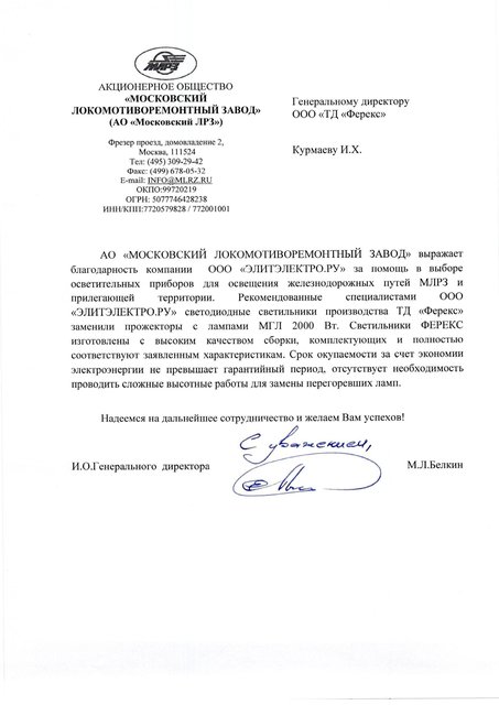 АО "Московский Локомотиворемонтный завод" выражает благодарность компании ООО "ЭЛИТЭЛЕКТРО.РУ" за помощь в выборе осветительных приборов для освещения железнодорожных путей МЛР3 и прилегающей территории. Рекомендованные специалистами ООО "ЭЛИТЭЛЕКТРО.РУ" светодиодные светильники производства ТД "Ферекс" заменили прожекторы с лампами МГЛ 2000 Вт.