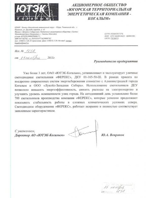 Уже более 3-х лет АО "ЮТЭК-Когалым" устанавливает и эксплуатирует уличные светодиодные светильники "ФЕРЕКС" ДКУ 01-165-50-Ш в рамках проекта по внедрению современных систем энергосбережения совместно с Администрацией города Когалым и ООО "Лукойл-Западная Сибирь".