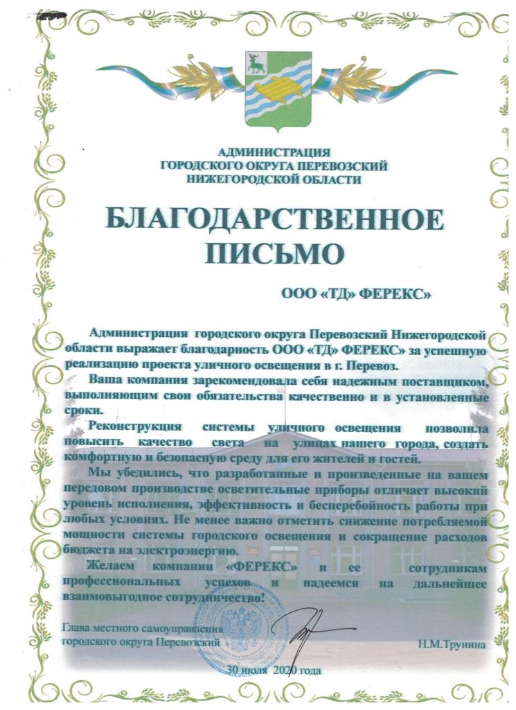 Администрация городского округа Перевозский Нижегородской области выражает благодарность ООО "ТД "ФЕРЕКС" за успешную реализацию проекта уличного освещения в г. Перевоз.