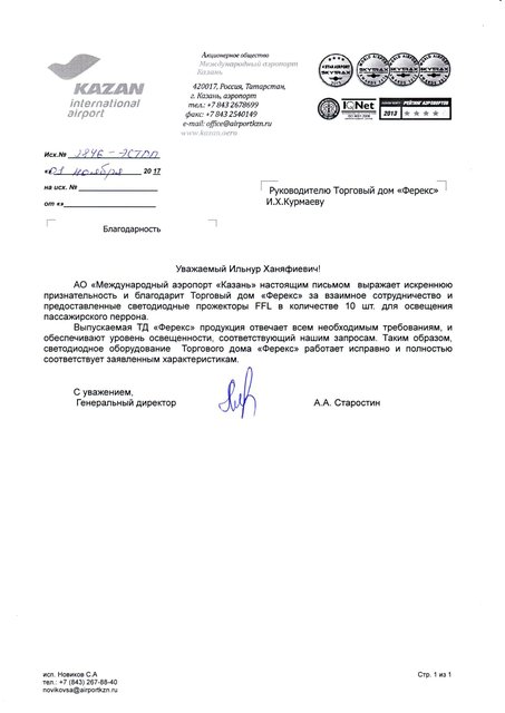 АО «Международный аэропорт «Казань» благодарит ООО "Торговый дом "Ферекс" за взаимное сотрудничество и предоставленные светодиодные прожекторы FFL в количестве 10 штук для освещения пассажирского перрона.