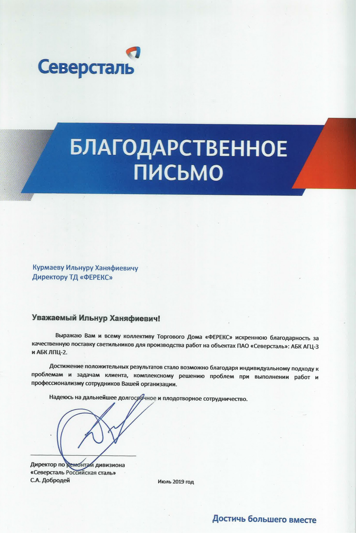 Руководство "Северсталь Российская сталь" выражает благодарность ТД "Ферекс" за качественную поставку светильников.