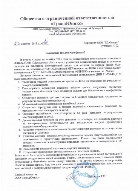 В период с марта по октябрь 2015 года на «Всесезонном горнолыжном комплексе» «СНЕЖ.КОМ» (Московская обл.) в целях улучшения освещенности трассы и снижения расходов на освещение искусственной трассы для катания на лыжах были заменены светильники Jet7 SM-RM с лампой МГЛ мощностью 400Вт в количестве 272 шт. на светильники ДПП 11-220-40-Д120 производства «ФЕРЕКС» в количестве 204 шт.