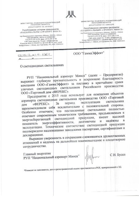РУП "Национальный аэропорт "Минск" выражает глубокую признательность и искреннюю благодарность компании ООО "ГаммаЭффект" за поставку в кратчайшие сроки уличных светодиодных светильников российского производтства ООО "Торговый дом "ФЕРЕКС".