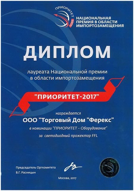 ДИПЛОМ лауреата Национальной премии в области импортозамещения «ПРИОРИТЕТ-2017» награждается ООО «Торговый дом «Ферекс» в номинации «ПРИОРИТЕТ-Оборудование» за светодиодный прожектор FFL.