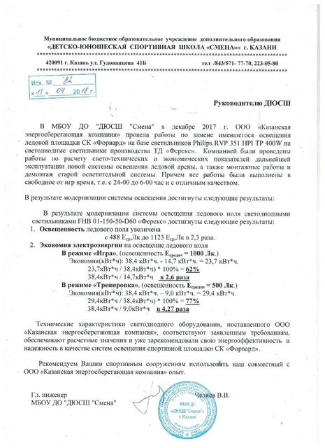 В МБОУ ДО "ДЮСШ "Смена" в декабре 2017 г. ООО "Казанская энергосберегающая компания" провела работы по замене имевшегося освещения ледовой площадки СК "Форвард" на базе светильников Philips RVP 351 HPI TP 400 W на светодиодные светильники производства ТД "Ферекс".