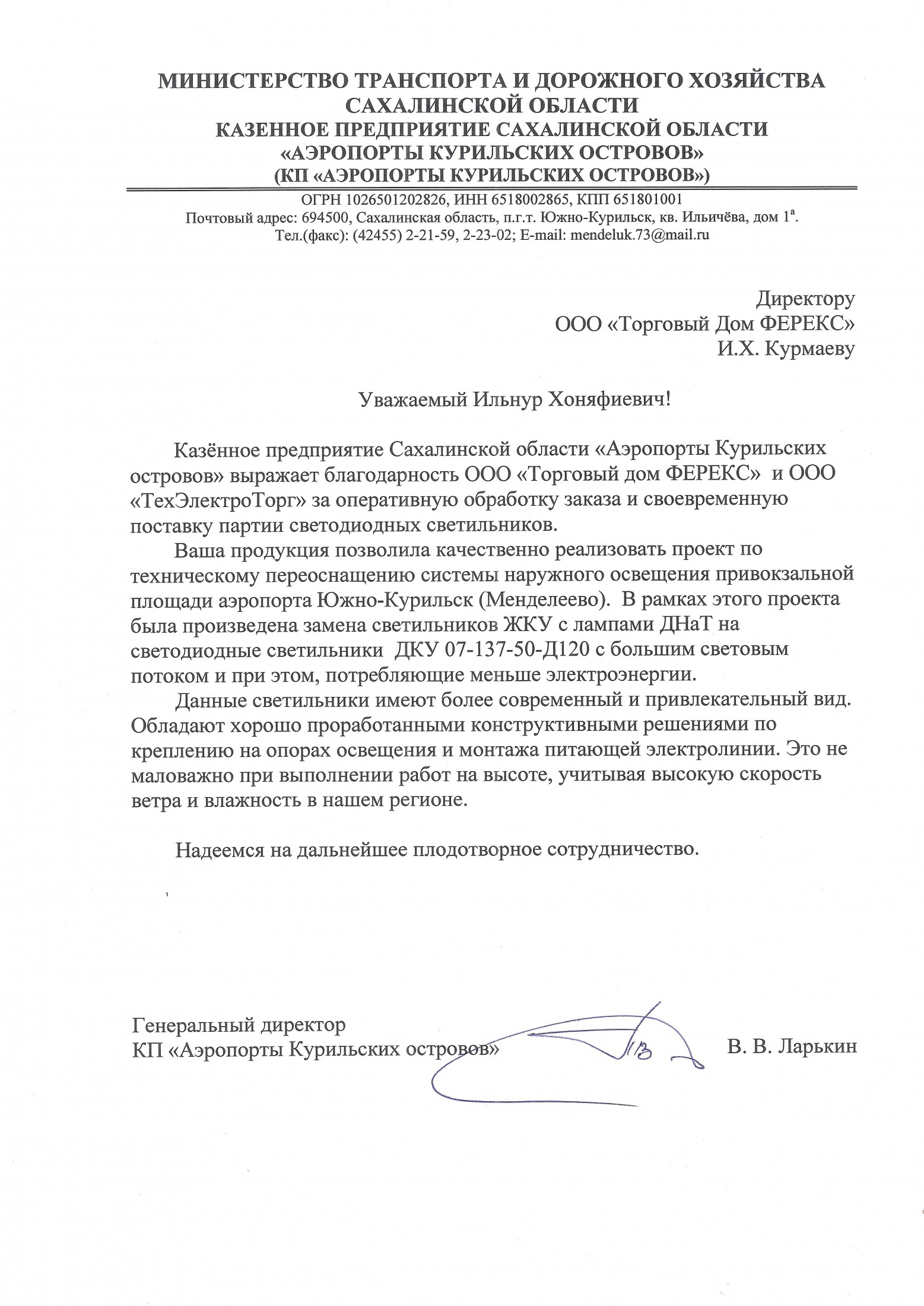 Казенное предприятие Сахалинской области «Аэропорты Курильских островов» выражает благодарность ООО «Торговый дом Ферекс» и ООО «ТехЭлектроТорг» за оперативную обработку заказа и своевременную поставку партии светодиодных светильников.