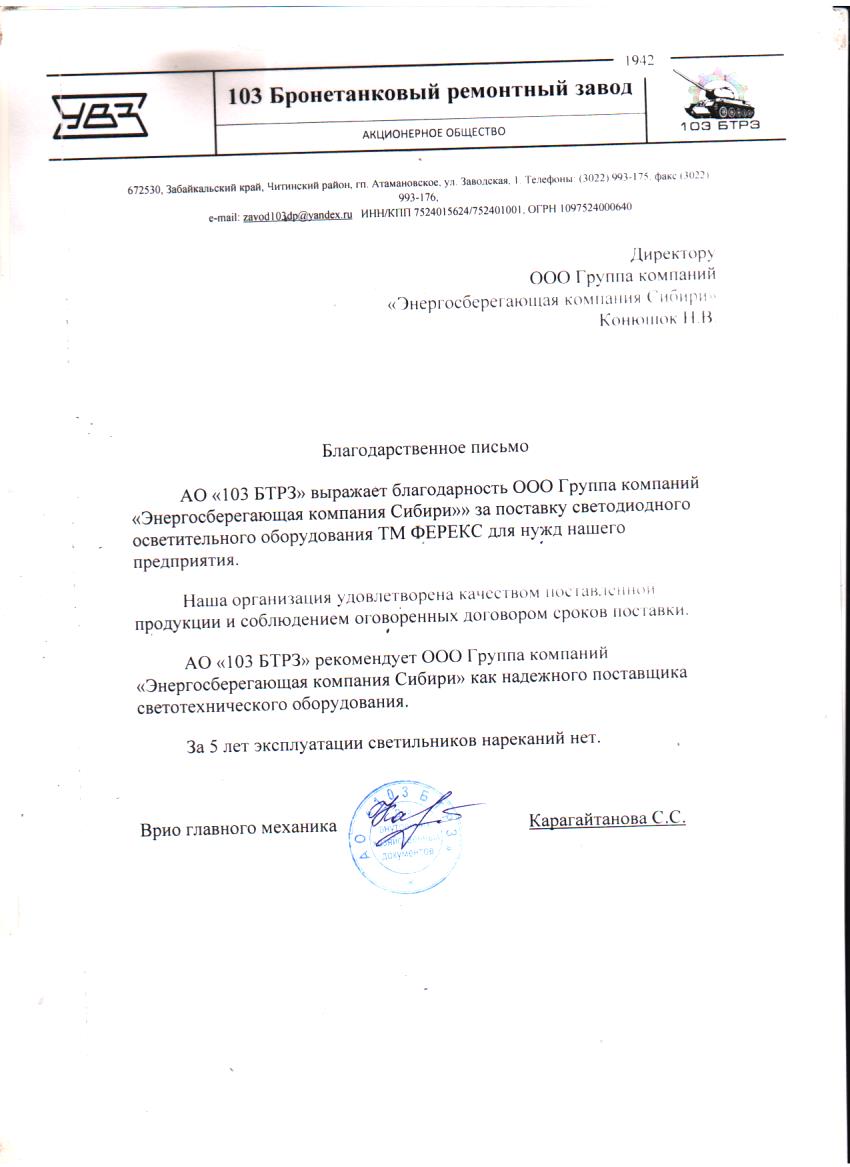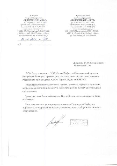 Производственное унитарное предприятие "Пинскдрев-Плайвуд" выражает благодарность за поставку и помощь при подборе качественного осветительного оборудования - светодиодных светильников российского производства ООО "Торговый дом "ФЕРЕКС".
