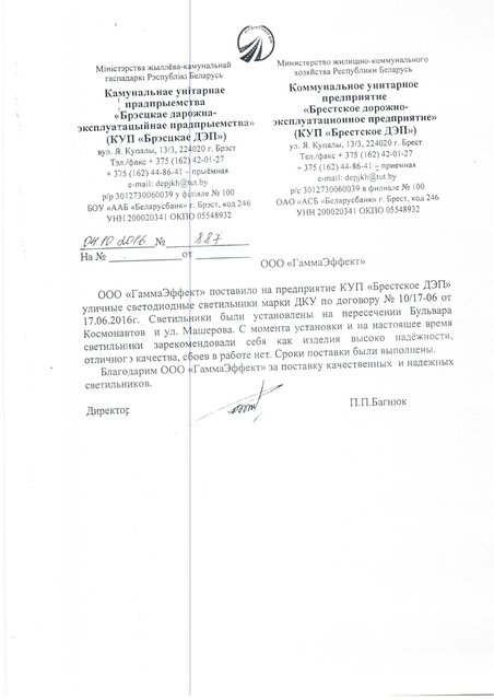 РУП "Национальный аэропорт "Минск" выражает глубокую признательность и искреннюю благодарность компании ООО "ГаммаЭффект" за поставку в кратчайшие сроки уличных светодиодных светильников российского производтства ООО "Торговый дом "ФЕРЕКС".