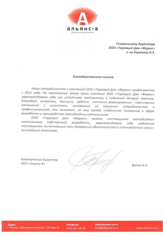 ООО «Торговый Дом «Ферекс», являясь поставщиком светодиодных светильников собственной разработки, зарекомендовало себя надежным поставщиком, выполняющим свои договорные обязательства в установленные сроки с высочайшим качеством.