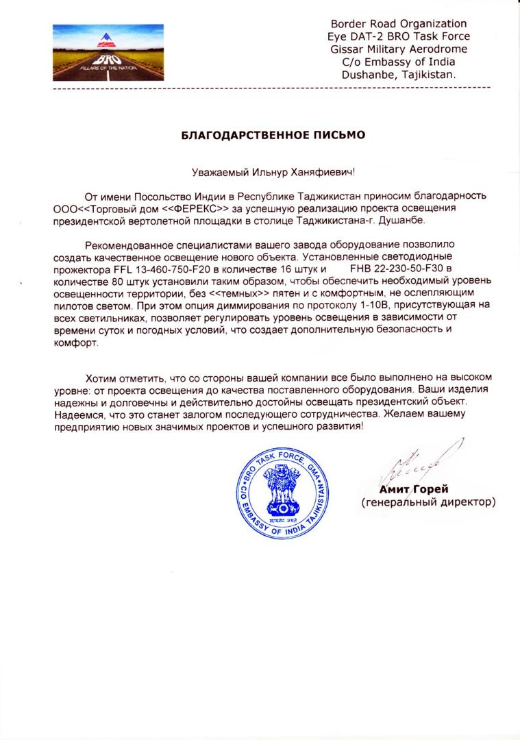 От имени Посольства Индии в Республике Таджикистан приносим благодарность ООО «ТД» ФЕРЕКС» за успешную реализацию проекта освещения президентской вертолетной площадки в столице Таджикистана – г. Душанбе.